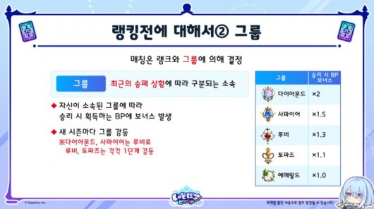 또한 자신이 소속된 그룹에 따라 대전 승리 시 획득하는 BP에 보너스가 발생한다. 랭킹전의 매칭은 같은 그룹 내에서 랭크가 비슷한 유저끼리 우선적으로 매칭되기 때문에 자신과 실력이 비슷한 상대와 대전을 즐길 수 있다.