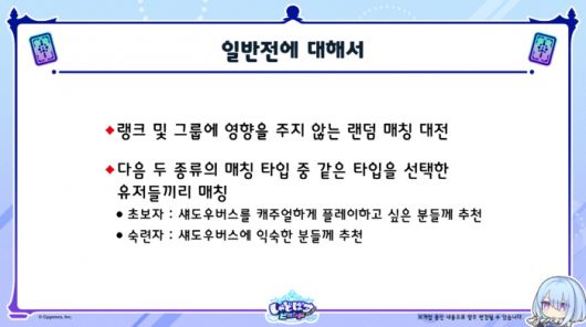 일반전은 랭크 및 그룹에 영향을 주지 않는 랜덤 매칭 대전으로 편하게 즐길 수 있다.