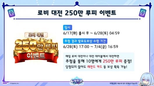 6월 17일(화) 출시 후부터 6월 28일(토) 04:59까지 매일 섀버 파크에서 도전할 수 있는 이벤트 미션을 달성하면 ‘250만 루피 이벤트 보물상자’를 1개 획득할 수 있는 ‘로비 대전 250만 루피 이벤트’를 진행한다.