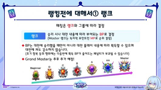 Beginner~AA는 대전 내용에 따라 부여되는 BP를 획득하면 랭크가 올라간다. Master는 Master의 독자적 포인트인 MP에 의해 순위가 결정된다.