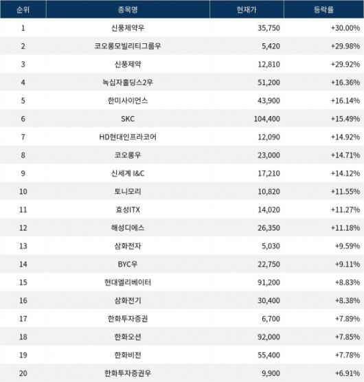6위 SKC(011790)는 종가 104,400원으로 15.49% 상승 마감했다. 7위 HD현대인프라코어(042670)는 종가 12,090원으로 14.92% 상승 마감했다. 8위 코오롱우(002025)는 종가 23,000원으로 14.71% 상승 마감했다. 9위 신세계 I&C(035510)는 종가 17,210원으로 14.12% 상승 마감했다. 10위 토니모리(214420)는 종가 10,820원으로 11.55% 상승 마감했다.