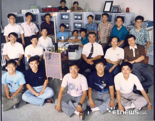 1992년 초여름 우리별1호 개발팀이 최순달 교수(두 번째 줄 가운데)와 함께 기념촬영을 했다. KAIST 제공 |