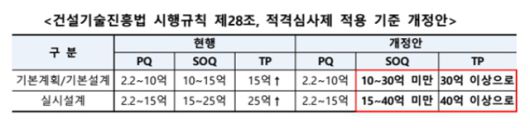 기본계획/기본설계는 SOQ 구간이 '10억~15억원'에서 '10억~30억원 미만'으로, TP는 '15억원 이상'에서 '30억원 이상'으로 바뀐다. 실시설계는 SOQ의 경우 '15억~25억원'에서 '15억~40억원 미만'으로, TP는 '25억원 이상'에서 '40억원 이상'으로 높아진다.