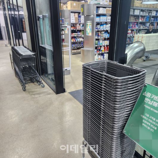 경기도 성남에 위치한 창고형 A약국 입구. 카트와 바구니가 비치돼 있다. (사진=안치영 기자) |