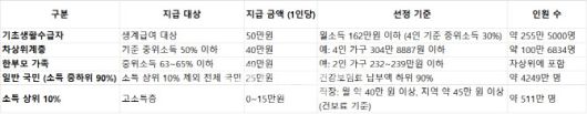 지급기준은 기초생활수급자는1인당 50만원, 차상위계층 및 한부모 가족은 1인당 40만원, 이밖에 소득 상위 10%를 제외한 전국민에 25만원씩 지급하는 방안이 유력하다. 소득상위 10%는 10만원~15만원만 지급하거나, 아예 배제하는 방안도 논의중인 것으로 알려졌다. 지원금을 차등 지급하기로 함에 따라 선정 기준이 중요해졌다. 어떤 기준을 적용하냐에 따라 지원금이 줄어들거나 아예 지급 대상에서 제외될 수 있어서다.