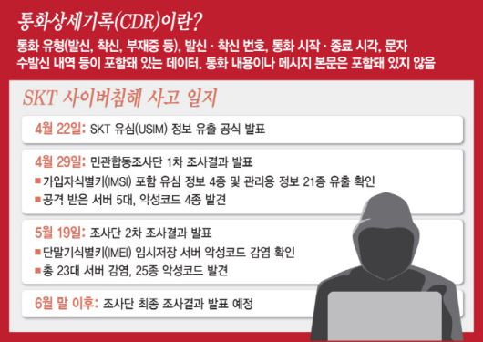 [이데일리 임유경 윤정훈 기자] SK텔레콤(017670) 해킹 사태가 새로운 국면을 맞았다. 유심(USIM) 정보 유출 사고 수습이 한창인 가운데, 추가로 통화상세기록(CDR)이 저장된 서버에서 악성코드가 발견됐을 가능성이 제기되면서다. CDR 데이터가 해커 손에 넘어갔을 경우 특정 인사의 동선, 행동 패턴 유출까지 가능해 주요 국가 안보에 직접적인 위협으로 작용할 수 있다. 다만, 정부는 국민에 공개할 위협이 추가로 확인되지 않았다는 입장이며, SK텔레콤도 CDR 데이터 유출 가능성을 일축했다.