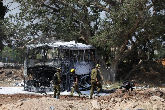 17일(현지 시각) 이스라엘 헤르츨리야에서 이란의 미사일 공격 이후 긴급대원들이 버스에 물을 뿌리고 있다. /로이터=연합뉴스 |