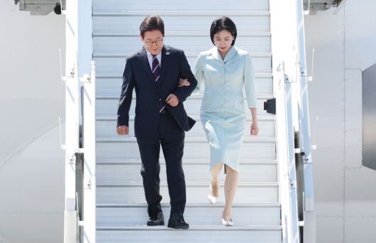 김 여사는 지난 16일 성남 서울공항에서 캐나다로 출국할 때도 눈에 띄었다. 김 여사는 민트색 계열의 정장 원피스를 입고 출국길에 올랐다. 전용기(공군 1호기)에 오르며 이 대통령 팔짱을 낀 모습도 주목을 받았다. 김 여사는 이 대통령이 전용기에서 즉석 기자간담회를 할 때도 옆에 서서 함께 했다.