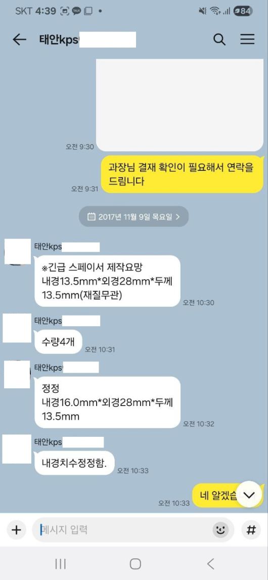 ‘태안화력 고 김충현 비정규직 노동자 사망사고 대책위원회’는 17일 김씨 휴대전화에서 발견된 김씨와 한전KPS 직원과의 카카오톡 대화를 공개했다. 2017년 11월9일 한전KPS 직원은 김씨에게 “긴급 스페이서 제작 요망” “수량 4개” 등 작업을 지시하는 메시지를 보냈다. 다른 직원은 “저희도 외주 가공하고 싶은데 너무 긴급이다”라며 김씨에게 작업을 의뢰하기도 했다.