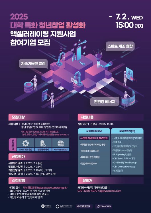 모집 대상은 경남지역에 본사, 지사, 공장, 연구소 중 하나 이상이 소재한 업력 7년 미만의 청년(만 39세 이하) (예비)창업기업이며, 각 대학별 특화 분야에 해당하는 7개사씩 총 14개 기업을 선발할 예정이다.