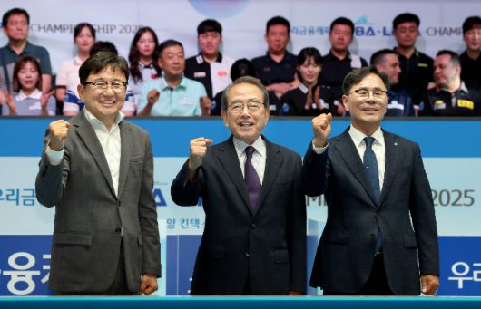 프로당구협회(PBA) 장상진 부총재(왼쪽부터), 김영수 총재, 우리금융캐피탈 기동호 대표이사가 17일 새 시즌 개막전인 '우리금융캐피탈 PBA 챔피언십 2025' 개막식에서 기념 촬영을 하고 있다. PBA |