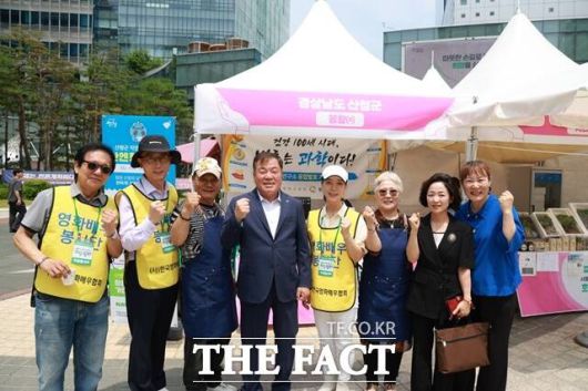 이승화(왼쪽 네번째) 산청군수가 서울 마포구 MBC 상암문화광장에서 경남과 경북 산불 피해 지역 7개 시군이 참여하는 희망장터에서 산청군을 홍보하고 있다./산청군 |