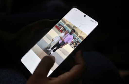 스마트폰 속 오른쪽 남성은 지난 12일 인도에서 발생한 최악의 비행기 추락사고의 희생자 중 한명인 로렌스 다니엘 크리스찬(30). 왼쪽은 그의 어머니. 로이터 연합뉴스 |