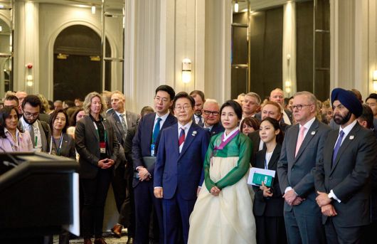 이재명 대통령과 부인 김혜경 여사가 16일(현지시간) 캐나다 앨버타주 캘거리의 한 호텔에서 캐나다 총독 내외 주최로 열린 주요 7개국(G7) 초청국 리셉션에 참석했다. 이날 김 여사는 '전통의상 혹은 정장'인 복장 규정(드레스코드)에 따라 연노란색 치마와 녹색 저고리 등 한복을 입고 행사에 참여했다. 캘거리 김호영 기자 |