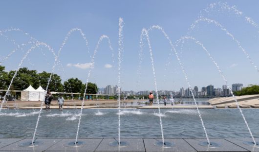 서울 낮 최고기온이 29도로 예보된 11일 서울 여의도 한강공원 물빛광장 분수대를 찾은 시민들이 더위를 식히고 있다. /사진=뉴스1 |