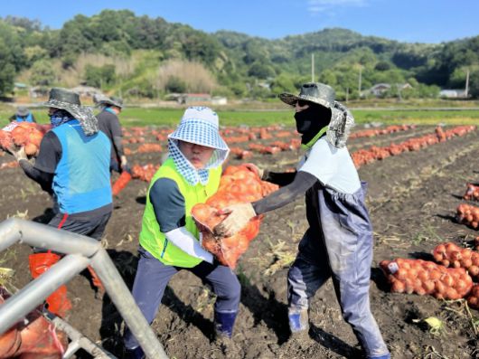 ▲전북농협과 화산농협 임직원 40여 명이 17일 완주군 화산면 양파 농가에서 양파 수확을 돕고 있다. ⓒ전북농협 |