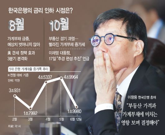 17일 금융권에 따르면 국내 시장 전문가들은 한은의 금리 인하 시점이 10월로 미뤄질 것이란 전망을 내놓고 있다. 지난달 금융통화위원회에서 금리인하를 결정할 당시만 해도 시장에서는 8월 금리인하설이 힘을 얻었지만, 가계부채 증가세가 가팔라지고 부동산 시장이 과열 양상을 보이면서 상황이 달라졌다.