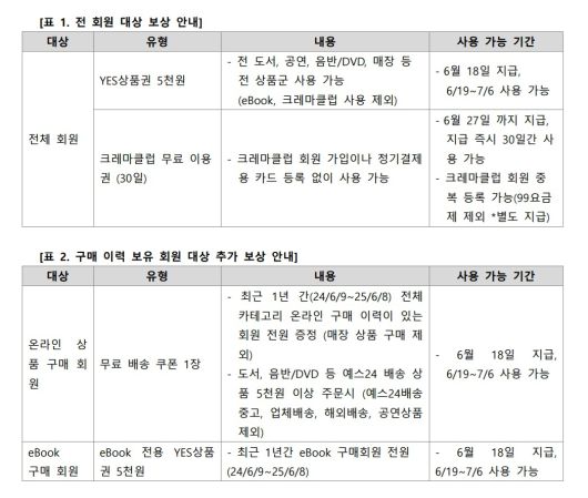예스24 상품권은 도서, 공연, 음반 및 DVD, 매장 등에서 전 상품군에 사용할 수 있다. 크레마클럽 무료 이용권은 27일까지 지급되며 회원 가입이나 정기결제용 카드 등록 없이 30일간 사용할 수 있다.