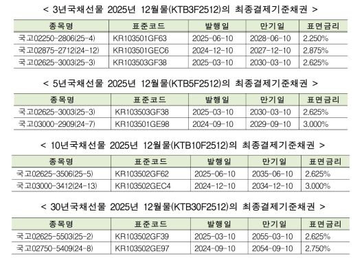 3년 국채 선물 2025년 12월물(KTB3F2512)의 기준 채권은 국고02250-2806(25-4), 국고02875-2712(24-12), 국고02625-3003(25-3) 등 3개로 선정됐다.