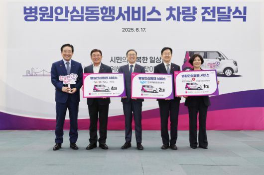 김광회 부산시 미래혁신부시장(가운데)이 17일 오전 10시 30분 시청 대회의실에서 '병원안심동행 서비스 차량 전달식'에 참석해 기념사진을 찍고 있다. [사진=부산시] 2025.06.17 |