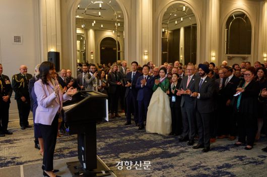 이재명 대통령과 김혜경 여사가 16일(현지시간) 캐나다 캘커리 한 호텔에서 열린 주요 7개국(G7) 정상회의 초청국 리셉션에 참석해 박수를 치고 있다. 김창길 기자 |