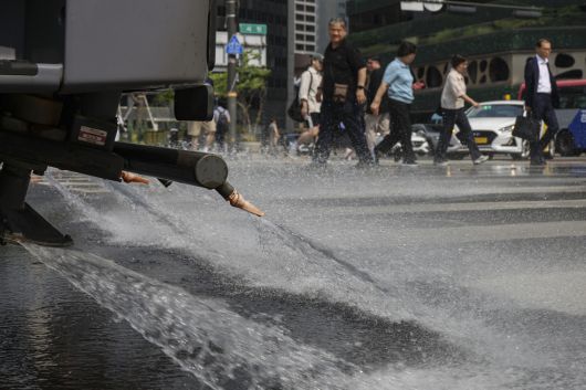 낮 기온이 30도를 웃돌고 후텁지근한 날씨가 계속된 17일 서울 덕수궁 앞 도로에서 폭염대비 도로열섬현상 완화를 위한 도로 물청소가 이루어지고 있다. 공동취재 |