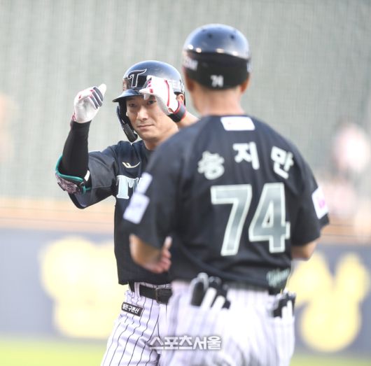 LG 신민재가 17일 서울 잠실구장에서 열린 2025 KBO리그 NC와 경기 1회말 우전안타를 친 후 세리머니를 하고 있다.2025. 6. 17.잠실 | 최승섭기자 thunder@sportsseoul.com [기사제보 news@sportsseoul.com] Copyright ⓒ 스포츠서울&sportsseoul.com
