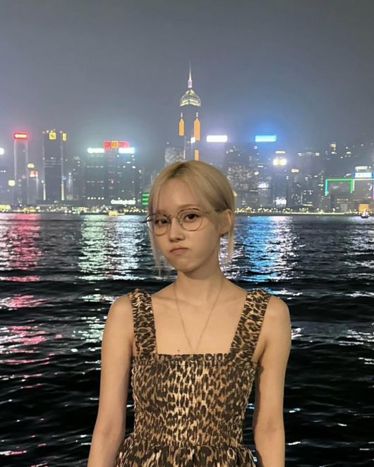 윈터는 홍콩의 야경을 배경으로 레오파드 패턴의 원피스를 착용했다. 원피스의 자연스럽고 여성스러운 실루엣과 강렬한 레오파드 패턴이 조화를 이루며, 전체적인 스타일에 강하고 스트릿한 인상을 남긴다. 또한, 얇은 안경을 더해 세련된 분위기를 강조했다.