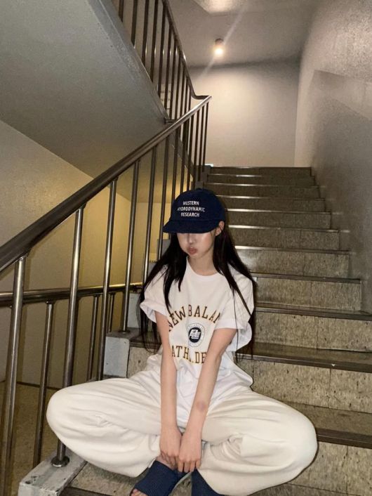 'WESTERN HYDRODYNAMIC RESEARCH'라는 문구가 새겨진 네이비 캡과 화이트 티셔츠와 조거 팬츠를 매치한 스타일도 눈에 띈다. 간결하면서도 개성 있는 아이템들이 조화를 이루며, 캐주얼하면서도 쿨한 분위기를 자아낸다.