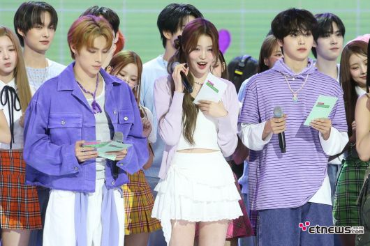 웨이션브이 샤오쥔, 이즈나 세비, 크래비티 형준이 10일 서울 상암동 SBS프리즘타워에서 진행된SBS funE ‘더 쇼’ 현장 미디어 공개 일정에 참석해 MC를 보고 있다. 전자신문인터넷 이승훈 기자 (mozart1205@etnews.com) [Copyright © 전자신문. 무단전재-재배포금지]