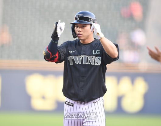 LG 문성주가 17일 서울 잠실구장에서 열린 2025 KBO리그 NC와 경기 2회말 1사 안타를 친 후 세리머리를 하고 있다.2025. 6. 17.잠실 | 최승섭기자 thunder@sportsseoul.com [기사제보 news@sportsseoul.com] Copyright ⓒ 스포츠서울&sportsseoul.com