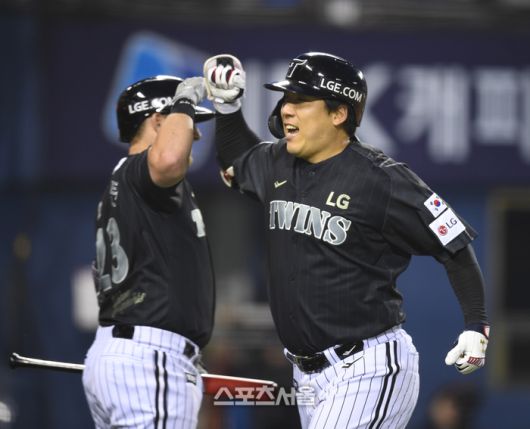 LG 김현수가 17일 서울 잠실구장에서 열린 2025 KBO리그 NC와 경기 5회말 1사1루 우월홈런을 날린 후 오스틴과 하이파이브를 하고 있다.2025. 6. 17.잠실 | 최승섭기자 thunder@sportsseoul.com [기사제보 news@sportsseoul.com] Copyright ⓒ 스포츠서울&sportsseoul.com