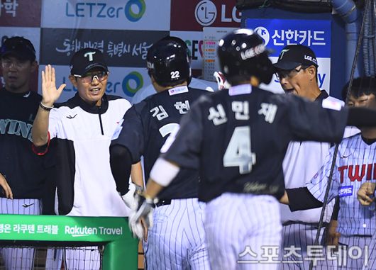 [스포츠투데이 팽현준 기자] 17일 서울 잠실야구장에서 열린 2025 KBO리그 NC 다이노스와 LG 트윈스의 경기, 5회초 1사 1루 홈런을 친 LG 김현수가 염경엽 감독의 환영을 받고 있다. 2025.06.17. [스포츠투데이 팽현준 기자 sports@stoo.com]