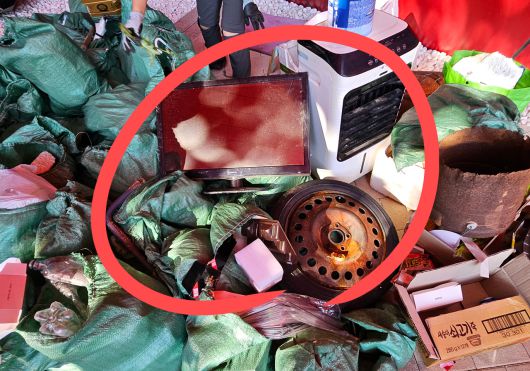 언뜻 봐도 수백㎏은 나가 보이는 쓰레기 더미. 바람 빠진 폐타이어에 부서진 공기청정기, 깨진 TV와 거울까지. 종류도 천차만별이다.