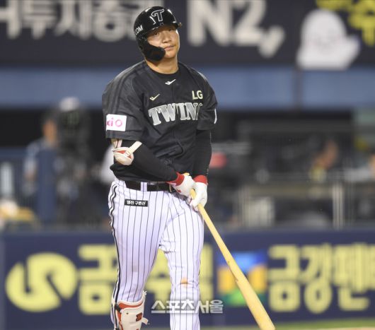 LG 문보경이 17일 서울 잠실구장에서 열린 2025 KBO리그 NC와 경기 8회말 1사 타구가 높게 뜨자 아쉬워하고 있다. 중견수 플라이 아웃.2025. 6. 17.잠실 | 최승섭기자 thunder@sportsseoul.com [기사제보 news@sportsseoul.com] Copyright ⓒ 스포츠서울&sportsseoul.com