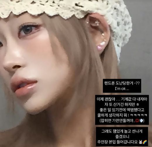 최준희는 17일 자신의 개인 계정에 "핸드폰 도난당한 거? I'm OK. 이제 괜찮아. 기계값 다 내자마자 또 산 거긴 하지만, 좋은 일 있기 전에 액땜했다고 쿨하게 생각하지 뭐"라고 적었다. 그러면서도 "잡히면 가만 안 둘 거야"라고 덧붙였다.