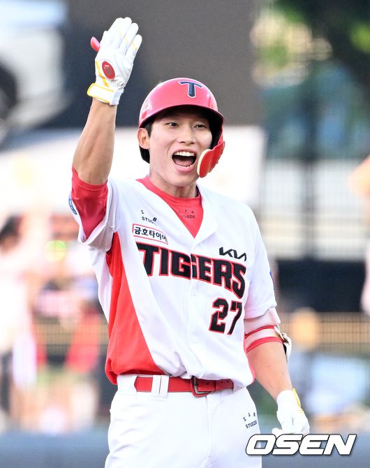 [OSEN=광주, 이대선 기자] 17일 오후 광주-기아 챔피언스필드에서 2025 신한 SOL Bank KBO리그 KIA 타이거즈와 KT 위즈의 경기가 열렸다.KIA는 김도현, KT는 헤이수스를 선발 투수로 내세웠다.1회말 2사 만루에서 KIA 김호령이 우월 3타점 적시타를 치고 환호하고 있다. 2025.06.17 /sunday@osen.co.kr