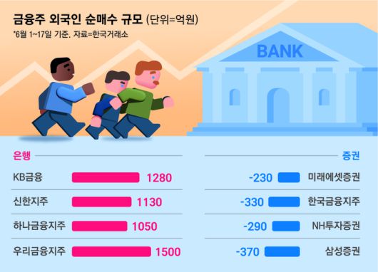 최정욱 하나증권 연구원은 “국내에서는 배드뱅크와 가산금리 인하 등을 우려하고 있지만 외국인은 시장 전체를 긍정적으로 보고 있다”며 “저평가 해소는 물론이고 우호적인 환율로 보통주자본비율(CET1)이 개선되며 주주환원 확대 기대감도 클 것”이라고 말했다.