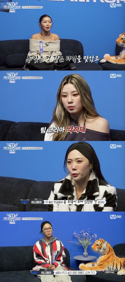 리정은 “‘팀 코리아 약하대. 얼마나 약하길래? 하고 구경하러 오는 기분이었다”라고 말했고, 앞서 워스트 댄서로 뽑히기까지 한 허니제이는 “첫 배틀 때 저도 너무 아쉬웠다. 안 좋은 댓글에 위축이 되는 것 같았다”라고 허심탄회하게 고백했다.