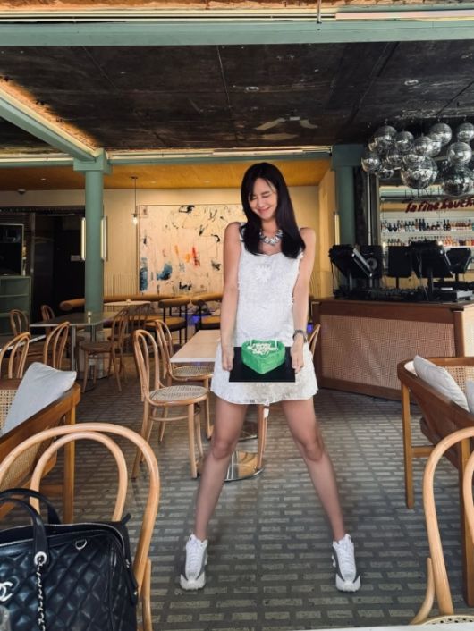 공개된 사진에는 케이크를 들고 포즈를 취하는 지소연의 모습이 담겼다. 임신 5개월차에도 늘씬한 몸매가 눈길을 끈다.