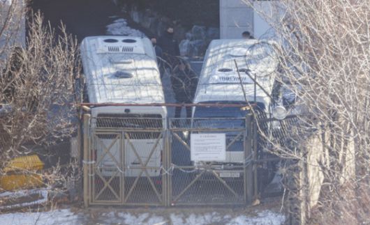 지난 1월 서울 용산구 한남동 관저에서 경호처 직원이 철조망이 쳐진 쪽문을 버스로 벽을 치고 있다. 〈사진=연합뉴스〉 |