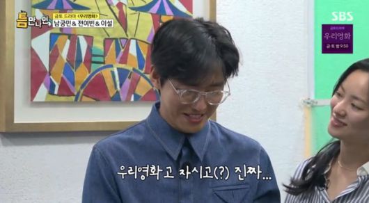 유연석은 드라마 '우리 영화'에서 남궁민이 감독 역할을 맡은 것에 대해 궁금증을 드러냈다. 유연석은 "실제로 감독 연출에 관심이 많으신가"라고 물었다. 이에 남궁민은 "실제로 영화 연출을 하면서 지금의 아내를 만났다"라며 아내 진아름에 대해 이야기했다.