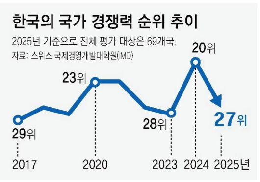 스위스 국제경영개발대학원(IMD)이 매긴 한국의 국가경쟁력 순위가 27위로 평가됐다. 역대 최고였던 20위에서 한 해 만에 7계단이나 내려앉은 것이다. 7계단이란 하락 폭은 한국이 1997년 평가 대상국에 포함된 후 최대다. 작년 12·3 비상계엄과 이어진 혼란 상황을 고려할 때 순위 하락은 어느 정도 예상됐던 일이다. 하지만 미국발 관세전쟁으로 국제경제 질서가 재편되는 가운데 드러난 우리 기업들의 경쟁력 하락은 심각한 위기 신호로 봐야 한다.