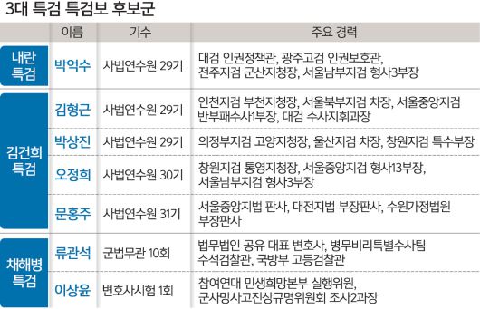 내란·김건희·채해병 의혹을 수사할 3대 특별검사들이 특별검사보 후보 추천작업을 마무리하면서 수사팀 윤곽이 점차 드러나고 있다. 후보군에는 검사와 판사, 군법무관 출신 등이 고루 포진했다.