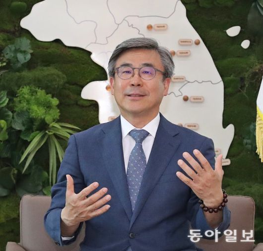 남태헌 한국산림복지진흥원장이 16일 대전 서구 산림복지종합교육센터 내 국내 최고층(7층) 목조건축물 집무실에서 동아일보와 인터뷰하고 있다. 남 원장은 “저출산과 고령화 시대에 걸맞은 통합형 산림치유 서비스가 절실하다”고 말했다. 대전=김태영 기자 live@donga.com |