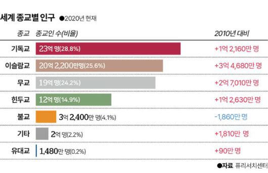 2010~2020년까지 10년 동안 전 세계에서 가장 빠르게 교세가 커진 종교는 이슬람교인 것으로 나타났다.