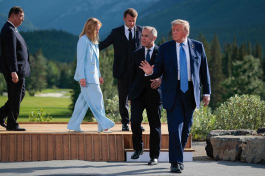캐나다에서 16일(현지시간) 열린 주요 7개국(G7) 정상회의에 참석한 각국 정상들이 로키산맥 앞에서 단체 사진을 찍은 뒤 이동하고 있다. 왼쪽부터 이시바 시게루 일본 총리, 조르자 멜로니 이탈리아 총리, 에마뉘엘 마크롱 프랑스 대통령, 마크 카니 캐나다 총리, 도널드 트럼프 미국 대통령. 캐내내스키스 AFP 연합뉴스 |