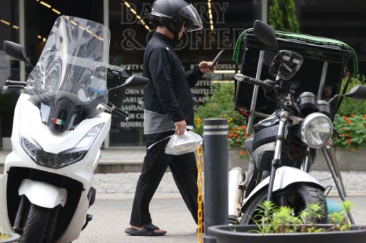 배달의민족과 쿠팡이츠가 도입한 배달앱 상생요금제가 새 정부 출범 이후 개편될 조짐이다. 사진은 17일 서울 강남구에서 한 배달원이 음식을 들고 가는 모습. 연합뉴스 |
