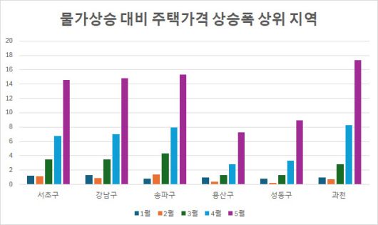 성동구와 과천 외에 광진구, 마포구, 양천구, 영등포구, 동작구와 용인 수지구도 4월, 5월 집값 상승률이 물가상승률의 1.3~1.5배를 초과했다. 5월에만 기준치를 초과한 곳까지 살펴보면 안양 동안구, 성남시, 성남시 수정구·분당구, 용인시, 하남시 등으로 확대된다.