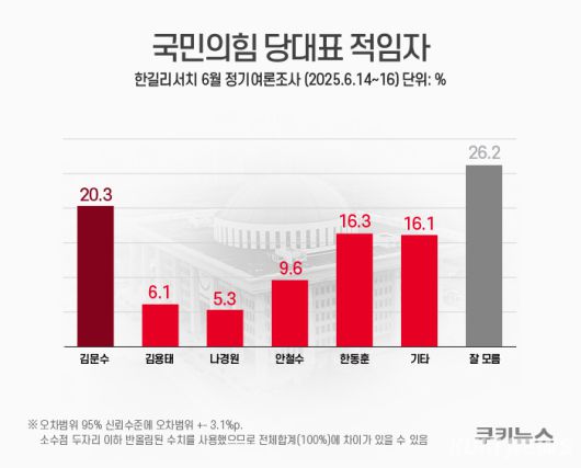 쿠키뉴스 의뢰로 여론조사 전문기관 한길리서치가 지난 14일부터 16일까지 전국에 거주하는 만 18세 이상 남녀 1008명을 대상으로 ‘차기 당대표 적임자’를 묻자 김 전 후보(20.3%)와 한 전 대표(16.3%) 오차범위 내 접전을 벌였다. 뒤이어 안철수 의원 9.6%, 김용태 비상대책위원장 6.1%, 나경원 의원 5.3% 순으로 나타났다. 잘 모름과 기타는 각각 26.2%, 16.1%로 집계됐다.